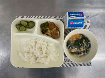 給食では、ゆでた豚肉をキャベツやピーマン一緒に炒めて、テンメンジャンなどの調味料を使って味付けしました。
