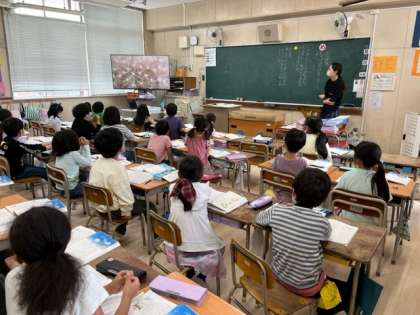 5月15日(月)2時間目、2年2組は国語で「たんぽぽ」でたんぽぽのひみつを探っていました。たんぽぽの綿毛ができる様子を動画で見ていました。