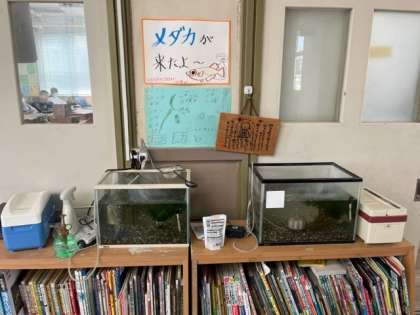 5月15日(月)5年生の教室の前にメダカの水槽が現れました。