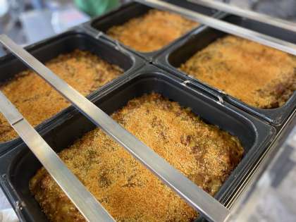 ミニバットに一クラス分ずつ入れて、パン粉と粉チーズをかけて焼き上げました。