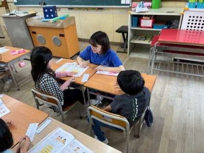 5月23日(火)1時間目、1年2組は算数で「7」を分解してできる数を調べていました。「1と6」「2と5」「3と4」「4と3」「5と2」「6と1」ですね。