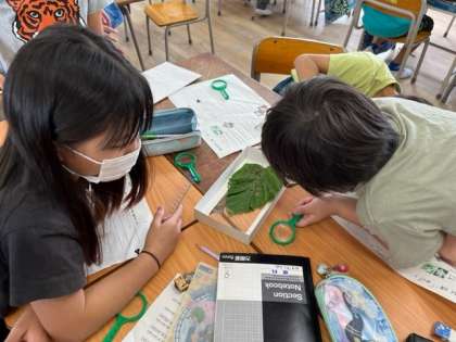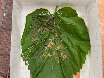 5月23日(火)2時間目、3年1組は総合でカイコやアゲハの観察をしていました。カイコが桑の葉を食べて葉の穴がたくさんあいていました。1mmもなかった卵から生まれたカイコが動き回るようになってることに子どもたちは驚いていました。