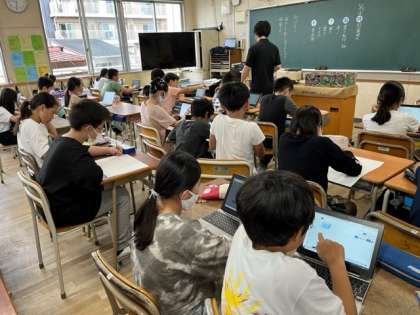 5月29日(月)1時間目、5年1組は体育でソフトボール投げの練習をしました。すぐに雨がふってきて教室へ戻りました。粉浜フェスティバルのポスター係はポスターを描いていました。それ以外の人はパソコンでデジタルドリルに取り組んでいました。