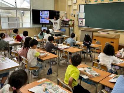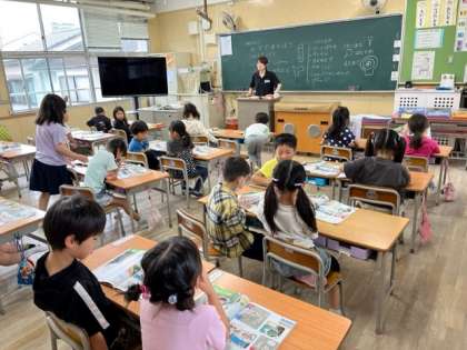 5月31日(水)1時間目、1年生は1組も2組も生活科で「みずで あそぼう」を学習していました。いろいろな容器を使って水でっぽうで遊ぶようです。的をどうするかを考えていました。1組は水にぬれても大丈夫な的を作ろうと考えていました。2組は的をティッシュのようなものでぶら下げて、ティッシュをねらうとおもしろいのじゃないかと考えていました。