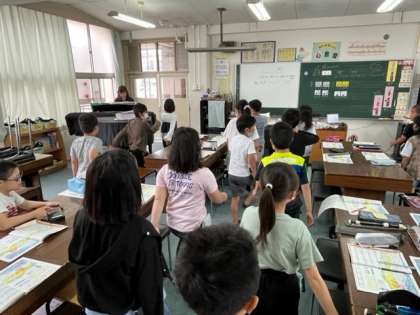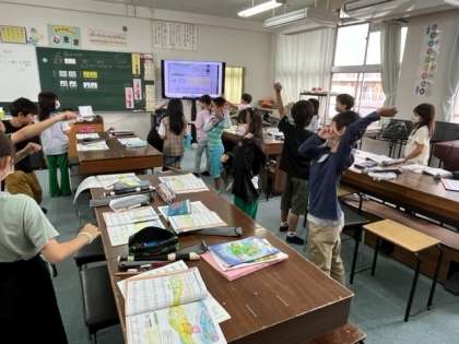 5月31日(水)1時間目、4年1組は音楽で8分の6拍子の「風のメロディ」のリズムを体全体で味わっていました。4拍子のリズムは行進してその違いを感じていました。
