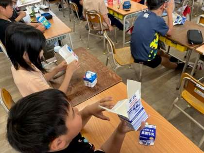 6月5日(月)1時間目、3年2組は総合でギュウニュウパックを使ってカイコの飼育箱を作っていました。
