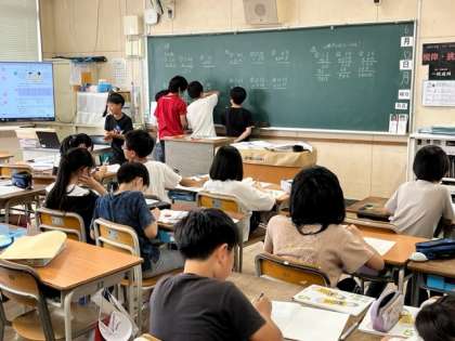 6月12日(月)3時間目、5年2組は算数で小数のかけ算の筆算を練習していました。