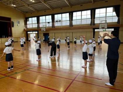 6月13日(火)2時間目、1年は体育館で体育をしていました。ラジオ体操をしていました。