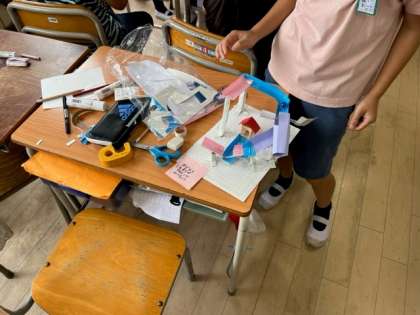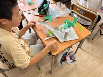 6月15日(木)3時間目、4年1組は図工で「ころことがーれ」を作っていました。うまく転がるかを試している人が多いようでした。