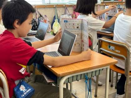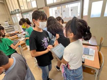 6月16日(金)4時間目、4年2組は外国語活動で曜日について学習していました。教科書をパソコンで写真に撮って、それをちょうどの大きさにトリミングし、そこへ、金土日ですることを絵に描いていました。その絵を使って、友達に「私は○○します。」と話しかけます。すると友達が「何曜日にですか?」と聞き返します。それに対して「○○曜日です。」と答えます。パソコンの扱いに慣れていて驚きました。最後は全員が描いたものをモニターに映して英語で言う練習をしました。
