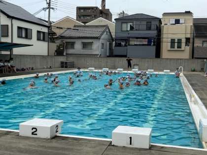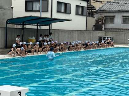 6月23日(金)2時間目、2年はプール開きでした。「あひるさん体操」の音楽に合わせて水に入っていました。