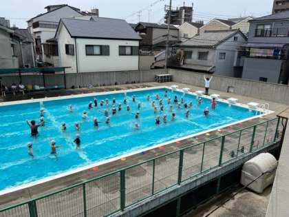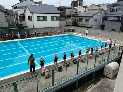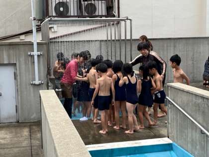 6月23日(金)3時間目、1年はプール開きを行いました。「地獄のシャワー」が待っていました。水が冷たかったのか、「キャー、キャー」と声が聞こえてきました。