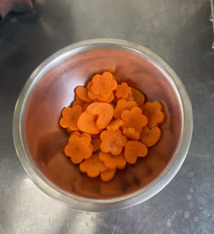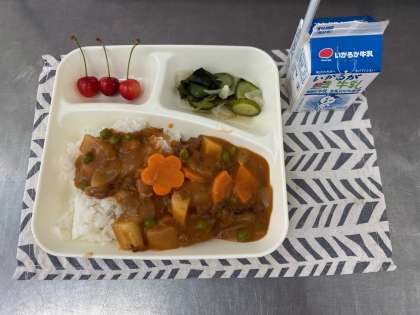 今日のハヤシライスは、お花やハートの形のラッキーにんじんが入っていました。自分のお皿に入っていた子どもたちは、喜んでいる様子でした。