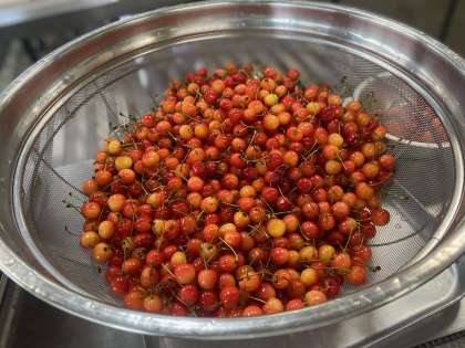 さくらんぼは、山形県産です。調理室では、丁寧に洗って傷みがないか確認しています。