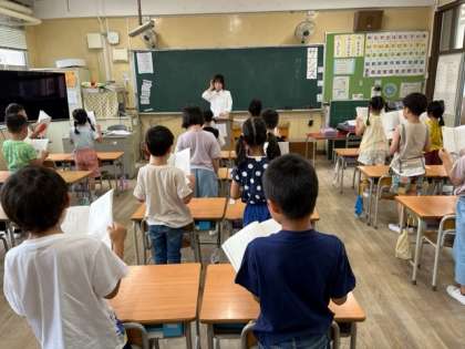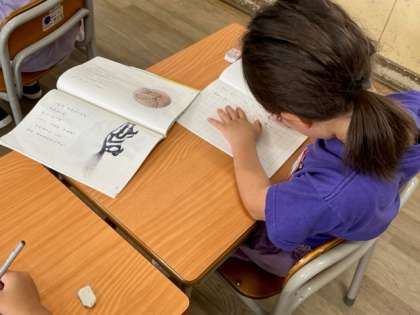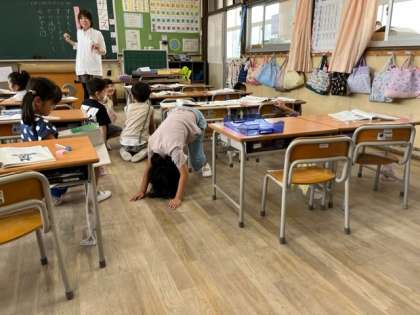 6月26日(月)1時間目、1年1組は国語で「どうやって みを まもるのかな」を学習しました。今日はスカンクの身の守り方について、教科書から読み取って、ノートに書いた後、スカンクの逆立ちを動作化していました。