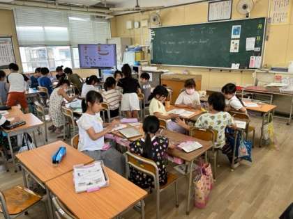 6月28日(水)1時間目、3年1組は外国語活動で「How many apples do you have?」の受け答えの練習をしていました。