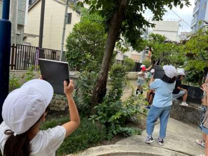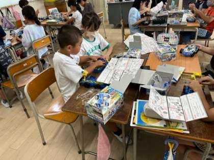 6月30日(金)5時間目、4年1組は理科でモーターカーを作りながら、雨ふりをうかがいながら夏の植物について観察していました。