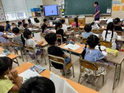 7月3日(月)2時間目、2年1組は国語で範読を聞いて、一人一人が小さい声で合わせて読んでいました。