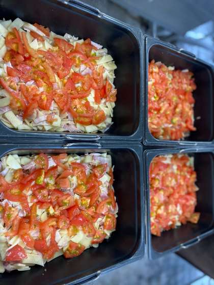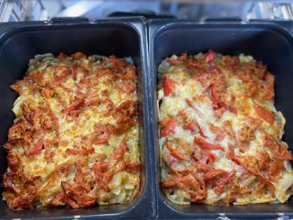 じゃがいもとトマトのチーズ焼きは、生のトマトを使っています。じゃがいもとベーコンを混ぜ合わせて、その上にトマトとチーズをのせて焼きあげました。