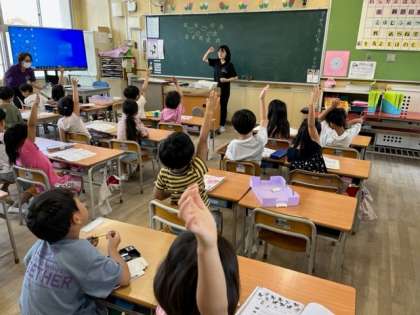 7月4日(火)1時間目、1年2組は算数で「どちらが、いくつ多い、少ない」を学習していました。