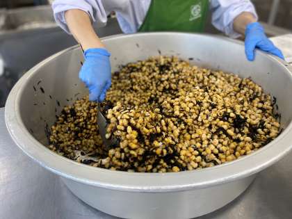 ひじき豆は、もどした大豆に片栗粉をまぶして油で揚げ、ひじき入りの甘辛いタレをからめます。豆が苦手な子どもたちも、「これは好き!」とうれしそうに食べていました。