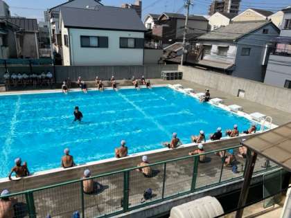 ?7月11日(火)1時間目、6年はプール水泳で、プールサイドに座って平泳ぎのキックの練習をしていました。
