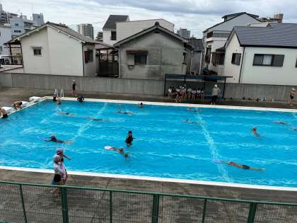 7月13日(木)1時間目、4年はプール水泳でプールを縦に使い、25mをどんどん泳いでいました。