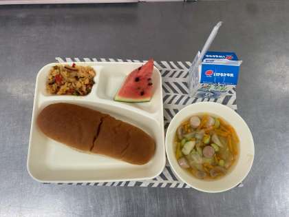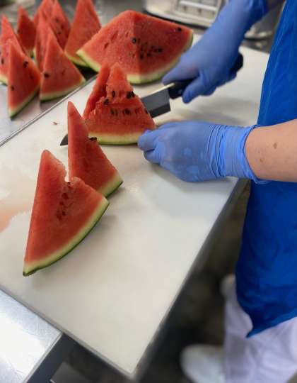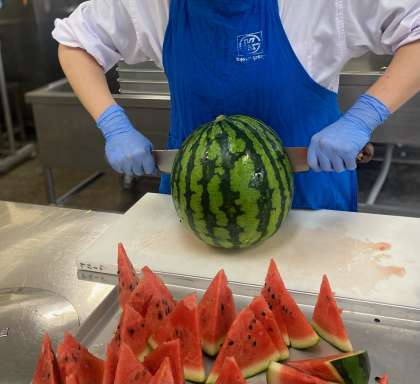 すいかは、1年に1回、給食に登場します。子どもたちが食べやすいように、大きなすいかを1/64に切り分けます。中心の甘いところが、できるだけぜんぶにあたるように切ってくれています。すいかは、夏の水分補給にぴったりです。