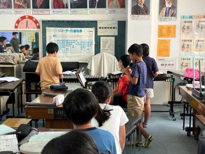 7月18日(火)1時間目、5年1組は音楽で班で合奏をしていました。最後に全員で合奏をしていました。だんだん演奏する楽器が増えていく曲で、上手に合奏していました。