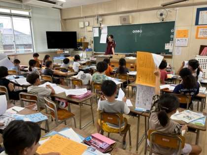 7月19日(水)1時間目、2年2組は学級活動で、夏休みの宿題や自由研究の話を聞いていました。