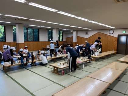 朝のつどいでラジオ体操をしました。今日のキーワードは「五感」です。子ども達は自然の中で何を感じるのでしょうか?食事係が朝食の準備を始めました。