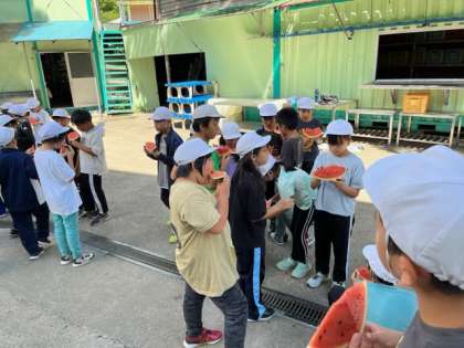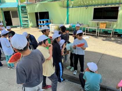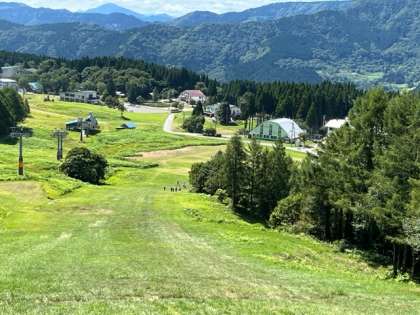 中腹から見えるアサヒロッジ。登山終了後、スイカをいただきました。