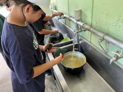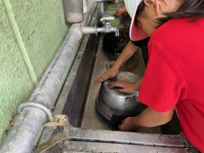 食後に片付けがはじまりました。恐怖の片付けチェックがこの後待っています。一発で合格する班は現れるのでしょうか。アサヒロッジのやり直し記録は14回です。これを更新する班も現れるのでしょうか?