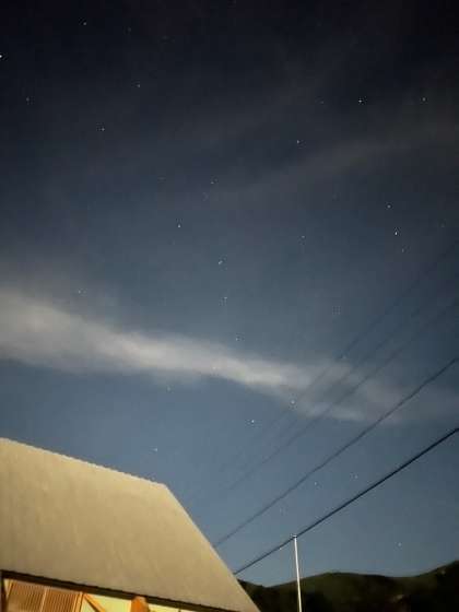 星空観察。今日は月が明るく雲があるので星空を見るには条件がよくありませんでした。しかし、北斗七星を見つけ、北極星、カシオペアと見えました。夏の大三角も見えました。南の空にはさそり座が見えました。