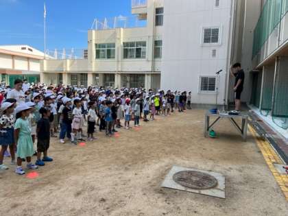 8月28日(月)始業式を校舎の影で行いました。水泳記録会の表彰と、学校玄関横にメダカの池ができたことと、校長先生が夏に読んだ本のお話をしました。2学期は「目にみえないもの」を大事にしてがんばってほしいと思います。