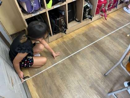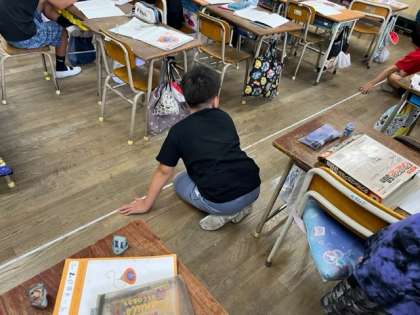 8月30日(水)1時間目、3年2組は算数で「巻き尺を使って長い物の長さを測ろう」というめあてで、教室の縦と横の長さを測っていました。