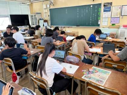 9月5日(火)1時間目、6年1組は国語で「話し合って考えを深めよう」を学習していました。話題は「きのこの山か、たけのこの里か」です。先生はこの話題では深まらないだろうと考えていたのですが、パソコンでそれぞれのカロリーを調べたり、歴史を調べ始め、おもしろいことになってきているそうです。