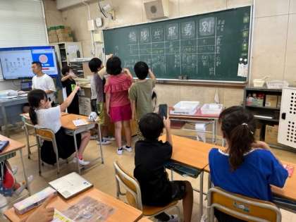 9月5日(火)2時間目、4年2組は国語で班ごとに前へ出てきて、漢字の読み方や部首を発表した後、みんなで書き順を確かめていました。