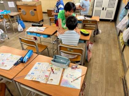9月6日(水)1時間目、3年1組は外国語活動で「色」を英語で言う練習をしていました。言う相手を見つけて、次々と「I like ○○(yellow等).」と話していました。