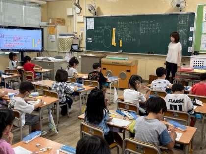 9月8日(金)1時間目、1年1組は算数で問題を読んで、たし算やひき算の式を考えて、問題と解いていました。