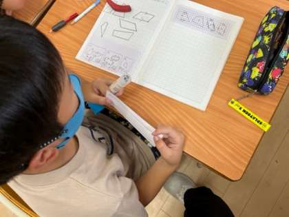9月8日(金)1時間目、4年2組は算数で辺のならび方を見て、図形を仲間分けしていました。
