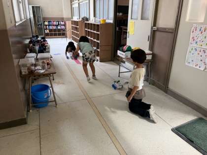 9月11日(月)5時間目、2年1組は生活科でヨットカーを作り、試しに走らせていました。