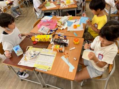 9月22日(金)4時間目、1年2組は生活科で牛乳パックを使って何か作っていました。何をつくっているのかを聞いても、子どもたちは教えてくれませんでした。