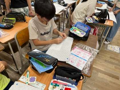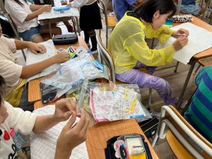 10月4日(水)3時間目、5年は1組も2組も家庭科でナップサック作りをしていました。
