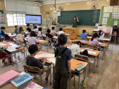 10月6日(金)1時間目、1年1組は算数で3+1+4の式になる問題を作っていました。