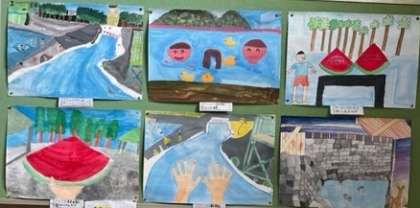 10月10日(火)5年の掲示板に「夏の思い出」の絵が掲示されていました。林間学習や家事で行った旅行等の絵がありました。林間の絵でなぜかスイカが大きく描かれているのは、山登りの後おいしかったのでしょうか。