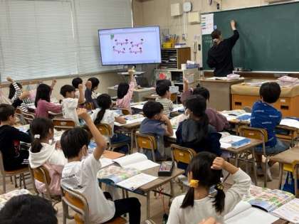 10月10日(火)4時間目、2年2組は「新しい計算のしかたを考えよう」を学習していました。絵を見て、計算のしかたを考えていました。ここからかけ算につながっていくようです。
