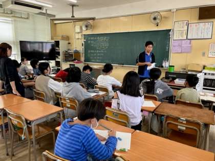 10月11日(水)1時間目、6年2組は算数で「時間と水の深さ」の学習をしていました。学級を2分割して学習していました。