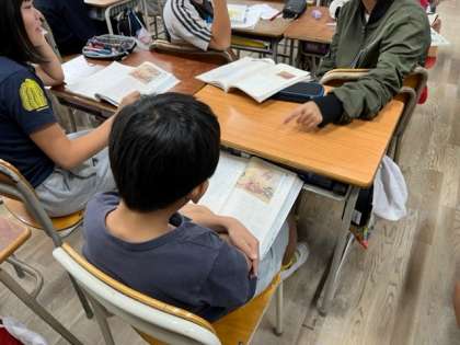 10月12日(木)1時間目、5年2組は廊下へ班で話し合っているような声が聞こえています。声が少し大きく、話し合っているようではありません。国語の「古文に親しむ」で「竹取物語」「平家物語」「徒然草」「おくの細道」を暗唱していました。覚えて友達に聞いてもらっているのでした。
