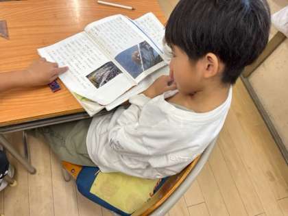10月17日(火)3時間目、2年2組は国語で「ビーバーの大工事」を学習していました。先生に「なぜ、ダムを作ったの?」と聞かれてその理由を教科書から探していました。